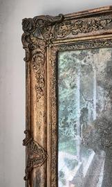 Bellissimo Specchio (Caminiera) antico con cornice dorata intagliata, in stile che richiama il tardo Barocco/Rococò o il primo Neoclassico, probabilmente realizzato tra la fine del XVIII e l’inizio del XIX secolo