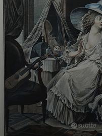 Antica stampa a colori francese intitolata L'Aveu Difficile (La confessione difficile). L'opera raffigura una scena d'interno con due figure femminili al tavolo da toeletta in abiti d'epoca. La stampa risale al 1883. Misura con cornice 59,8 x 50,5 cm. Firmata sotto in basso a destra: "Ch. Goulet Sc." (probabilmente Charles Coulet). La sigla "Sc." sta per sculpsit (ha inciso in latino), indicando che si tratta dell'incisore dell'opera. Data: L'anno "1883" indica l'anno di creazione o pubblicazione dell'opera.