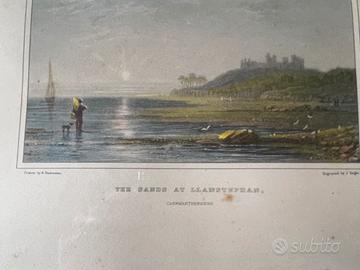 Questa opera è una stampa antica incisa su acciaio intitolata "The Sands at Llanstephan, Caermarthenshire". Realizzata intorno al 1830, l'immagine raffigura una veduta costiera del Galles con il castello di Llansteffan che domina il paesaggio dall'alto di un promontorio.
