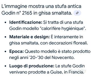 Antica stufa in ghisa smaltata Godin. Funzionante occupa pochissimo spazio con le sue dimensioni ridotte 35x35x70 cm. In ghisa smaltata. Epoca 1920/1930, francese, si può utilizzare anche come elemento di arredo. Ritiro a mano, solo in zona Peveragno e Cuneo. Per ulteriori informazioni, oltre quelle presenti in foto, mandami pure un messaggio.