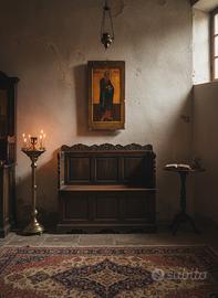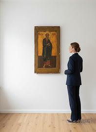 Importante icona sacra dipinta a olio su tavola, raffigurante un santo in