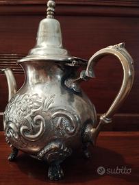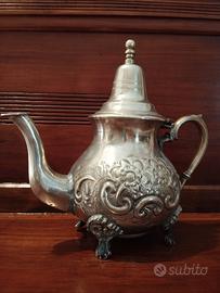 Bellissima antica teiera in metallo argentanto, lavorato manualmente con tecnica a sbalzo; un affascinante oggetto iconico della cultura marocchina, perfetto per impreziosire un angolo del tuo salotto ✨