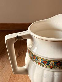 Ceramica di Pregio: Il set comprende catino e brocca coordinata in terraglia forte, decorati con un raffinato motivo geometrico policromo.