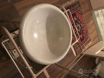 Toeletta antica e originale ben conservata con struttura in ferro e lamiera smaltata con specchio regolabile, vasca in lamiera smaltata perfetta e bricco smaltato, tutti componenti originali dell'insieme.