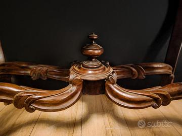 con gambe mosse scolpite, traversa centrale tornita e ricchi intagli a motivi