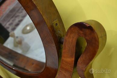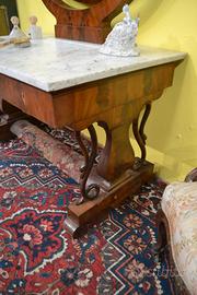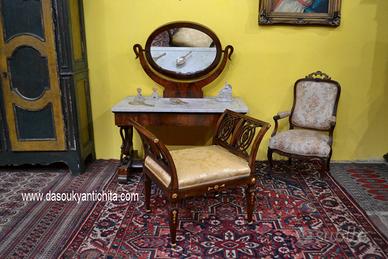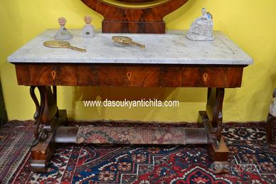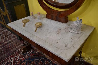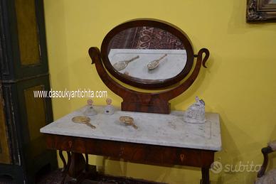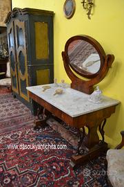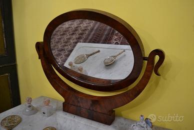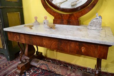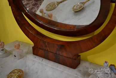 Intramontabile toilette in stile Carlo X della fine dell’800 inizi 900, in mogano impiallacciato, con venature fiammate, specchio ovale basculante montato su supporti curvi, anch’essi in mogano, che ne consentono la rotazione. meraviglioso piano in marmo di Carrara tagliato in una forma rettangolare con un’evidente curvatura sul lato frontale, adattandosi al design della console o della specchiera.