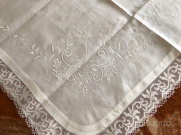 Antica tovaglia da Santella, in lino, ricamata a mano. Dimensioni: cm. 136 x cm. 69.