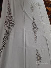 Antica tovaglia del 1956 in puro Lino 12 posti con ricami a mano in merletto di Burano misura mt290× 170 più dodici tovaglioli misura 40 x 40 + 12 sottobicchieri 10cm diametro più due sotto bottiglie14cm diametro,più una tovaglia da the misura 90×90 con 12 tovaglioli misura 20 x 20 sempre con ricami in merletto di Burano. Per eventuali info e foto contattami