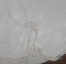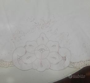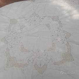 tovaglia rotonda diametro cm 160 con intagli in uncinetto e ricami. ton su ton color panna