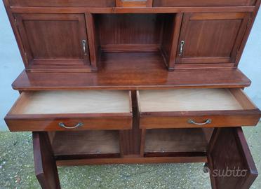 Antica d'epoca inizio 1900 credenza doppio corpo vetrina stile liberty art nouveau. Con vetri piombati motivo romboidale e molati. Parte inferiore con due ante con ripiano interno e due cassetti. Nella parte superiore presenti 4 ante con ripiani interni. Maniglie e fregio originali in ottone.