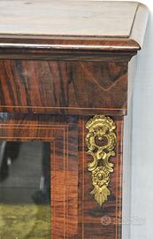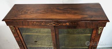Vetrinetta inglese d’epoca vittoriana, databile alla seconda metà dell’800, realizzata in legno di noce con splendide venature naturali, ed impreziosita da intarsi in ebano e legni di frutto.