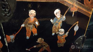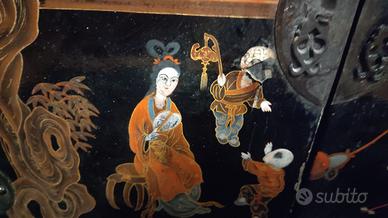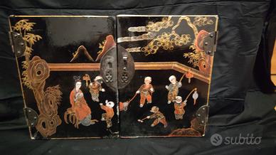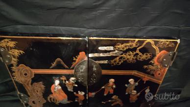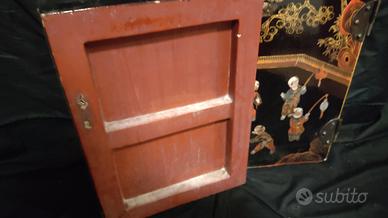 vendo bellissima coppia di ante . è un recupero di un vecchio mobile(credenza) Cinese della metà del 900.. perfette come elementi di arredo e per creare progetti di design decorativi.. all' interno vernice rossa opaca. esternamente una laccatura nero lucido con decori e dettagli rifiniti a mano. circa 40x50cm
