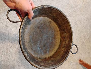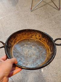 Robusti manici in ferro forgiato, rivettati al corpo in rame, ideali per appenderla o sollevarla. L'interno presenta i resti di una stagnatura, con evidenti segni di usura e ossidazione, che ne confermano l'uso originale in cucina.