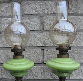 antiche lampade francesi a petrolio in opalina verde complete di campane e ancora funzionanti altezza +-80cm