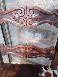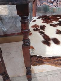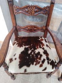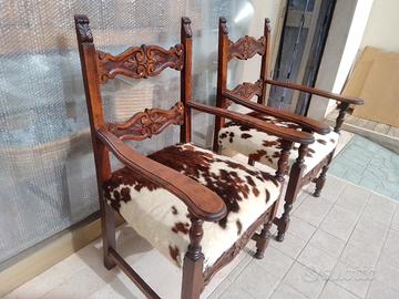 antiche poltrone in legno massello di rovere,con vera pelle di mucca,con intaglio,tornite ,ampia seduta XL restaurate e tappezzate in vera pelle rifinite, ottime condizioni robuste e solido sostegno, misure: ampia seduta 56x52 altezza seduta45 altezza totale spalliera cm 100 per arredi di casolari rustici baite o semplicemente davanti a caminetto.