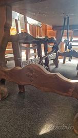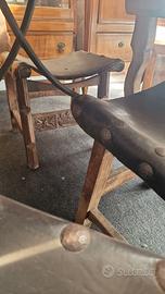 Questa sedia è una seduta in stile spagnolo o "Vecchia Castiglia", caratterizzata da una struttura in legno massiccio e rivestimenti in cuoio fissati con grosse borchie decorative. Al prezzo di 2200 aggiungo anche il tavolo in foto con ferro battuto che unisce e mantienne rigide le gambe originali del tavolo. Solo sedie al prezzo di 1500