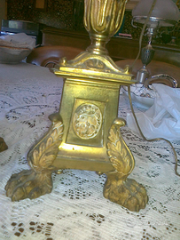 Coppia antichi candelieri da altare, provenienza cappella privata di nobile famiglia, epoca XVIII/XIX sec. Sulla base è raffigurato lo stemma di famiglia, l'araba fenice che risorge dalle sue ceneri. Poggiano su possenti piedi leonini. In epoca successiva i candelieri sono stati predisposti per l'elettrificazione, intervento effettuato con grande professionalità che lo rende praticamente invisibile e armonico. Misure h cm. 57 circa. Intervento da fare sulla doratura. Prezzo riferito alla coppia.