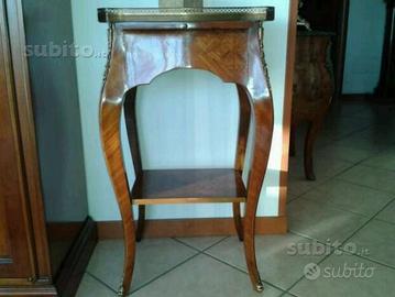 Tavolino stile luigi XV in radica di mirto rettangolare alto 76 cm largo 42 e profondo 35 con intarsi marqueterie tipo Maggiolini alto 76 cm . Presenta decori in ottone dorato un cassettino laterale un piccolo scrittoio estraibile a scomparsa e ripiano basso. Ideale come porta telefono in ingresso o porta lampada in soggiorno. Eseguito negli anni 90. E 500.
