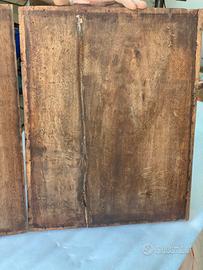 Legno massello (spesso rovere o noce) con lavorazione a bassorilievo.
