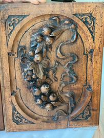 Questo oggetto è un pannello decorativo in legno intagliato, probabilmente parte di un mobile antico come una credenza o un armadio, databile tra il XIX e l'inizio del XX secolo.