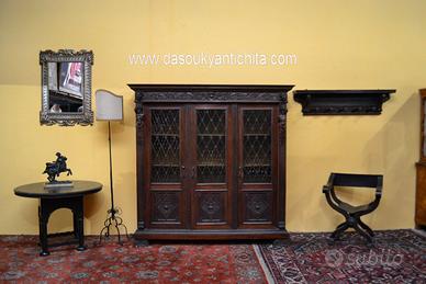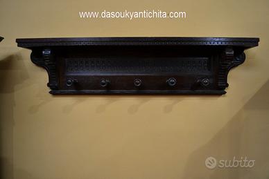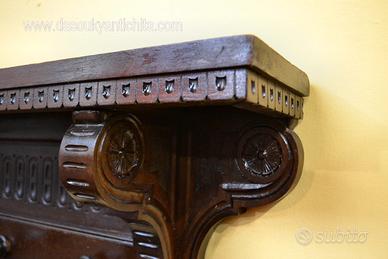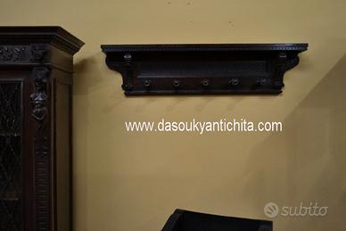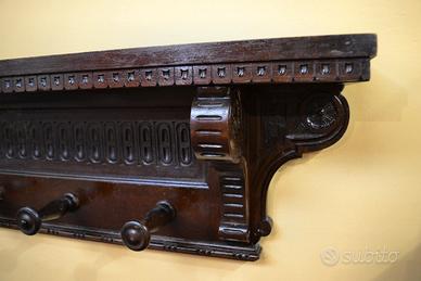 Imponente appendiabiti – cappelliera da muro stile Neorinascimentale francese del XX secolo in noce massello intagliato a mano con una patina scura molto ricercata.