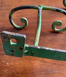 Antico appendiabiti in ferro battuto a tre posti con chiodi ribattuti di provenienza piemontese primi 900. Dimensioni complessive circa 60 x 30 cm peso circa 3 kg. Oggetto interessante e di effetto per arredamento vintage/moderno. Consegna a mano provincia di La Spezia e zone limitrofe.