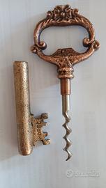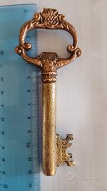 Apribottiglie vintage a forma di chiave, realizzato in ottone massiccio con un design decorativo che ricorda le chiavi antiche. Dettagli del Prodotto Funzione: Viene utilizzato principalmente come apribottiglie per tappi a corona (la parte superiore dell'impugnatura funge da leva). Questo modello di epoca sovietica nasconde anche un cavatappi all'interno del fusto. Origine e Design: La scritta "POREC" incisa sulla parte inferiore suggerisce che si tratti di un souvenir proveniente da Parenzo (Poreč), una nota città costiera in Croazia. Questo tipo di oggetti era molto popolare come ricordo turistico o oggetto da collezione durante la metà del XX secolo. Stile: Il design dell'impugnatura (mappa) è finemente lavorato con motivi ornamentali che richiamano lo stile barocco o rinascimentale, tipico delle riproduzioni di chiavi per mobili d'epoca.