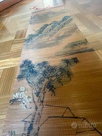Antico arazzo giapponese vintage dipinto a mano in bamboo (bambú) arrotolabile.