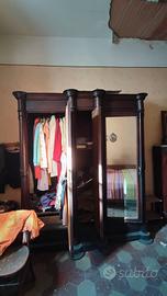 Splendido armadio autentico della metà dell'Ottocento, pezzo di alto antiquariato in legno nobile. Il mobile si distingue per le sue tre ante dotate di specchi originali dell'epoca con argentatura integra, che donano una profondità e una luce unica agli ambienti.