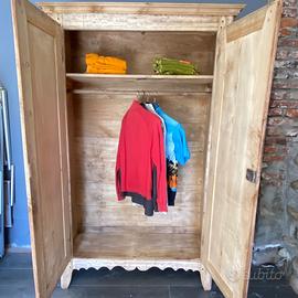 Antico armadio piemontese epoca primi 900 fratinato nella parte inferiore pezzo unico con porte in battuta e cerniere esterne interamente di legno massello di pioppo, mobile sverniciato lavato e grattato legno grezzo al naturale da mantenere come da foto oppure finire a piacere. Pronto da usare da inserire in tutti i contesti di arredo antico e moderno, Mobile d'epoca originale completo di bastone per appendere, porta con serratura funzionante Misura: 113 × 45, altezza 195 cm solo ritiro in loco Cossato BI possibilità di consegna nel raggio di 100 km da concordare dopo visione Se sei interessato e desideri ulteriori dettagli o per visionare l’armadio wzap per appuntamento se hai altre domande contattami altri armadi disponibili nelle mie inserzioni