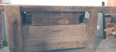 Vendo, antico banco da falegname. Integro,originale, mai restaurato. Molto robusto con 2 morse e due cassetti. Ideale anche da trasformare in bancone per negozi, bar o penisola per cucina. Misure 2,27×73 altezza 89.