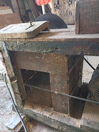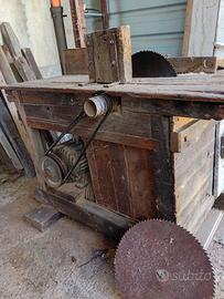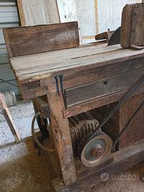Pesantissimo bancone in LEGNO MASSICCIO di quercia e castagno di Fine 1.700 per Sega Circolare a disco e altra di ricambio . Funzionava da Turbina ad acqua , poi adattato elettrico con enorme motore altrettanto coreografico.