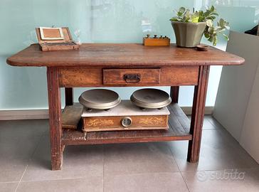 Bancone da lavoro in legno massello - misura 175 x 79 x 89. Tenuto molto bene. La vecchia bilancia e gli altri oggetti sono solo di presentazione e non sono in vendita con il bancone.
