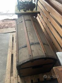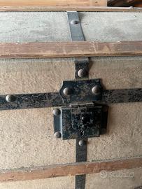 Vendesi Antico Baule Bombato Primi '900 - Interno in carta fiorita che si presume originale. Periodo 1890-1920, modello con tipico coperchio bombato. Oggetto autentico, ideale come elemento d'arredo scenografico o ad uso contenitore. Oggetto d’antiquariato. • Interno: Straordinariamente conservato, rivestito con carta decorata che si presume originale del periodo, a motivi floreali (stile Liberty). Un dettaglio raro che ne permette l'uso anche aperto. • Struttura: Legno massello e rinforzi metallici chiodati con patina autentica. • Chiusure: La chiusura metallica di sinistra è guasta (manca la bindella di aggancio). La serratura centrale e quella destra sono presenti. • Chiavi: Non presenti (il baule è però regolarmente apribile e funzionale). • Condizioni: Oggetto "vissuto" non restaurato, perfetto per amanti del vintage autentico. •Misure : 100x50x50 circa. •Consegna esclusivamente a mano. Non si effettua spedizione. IMPORTANTE: Le grucce visibili in foto hanno scopo puramente illustrativo per mostrare la capienza e l'estetica dell'oggetto; NON sono incluse nella vendita del baule. TAG: Baule vintage, baule antico, shabby chic, arredamento rustico, baule bombato.