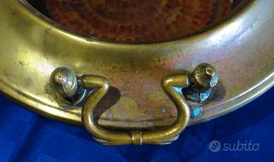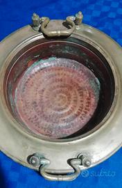 Originale e antico braciere in ottone e rame martellato, con manici,