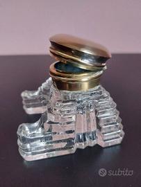 NO PERDITEMPO. Antico calamaio in cristallo e metallo, anni '30. Sul davanti spazio per appoggiare la penna.