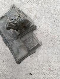 Antico calamaio in ottone con presente una statua di leone. Il prodotto presenta alcuni danneggiamenti, visibili in foto.