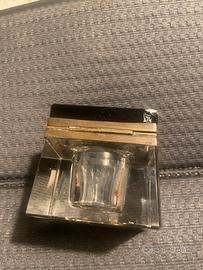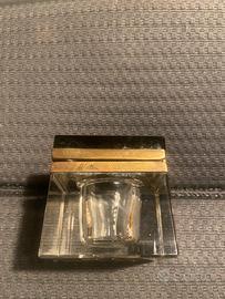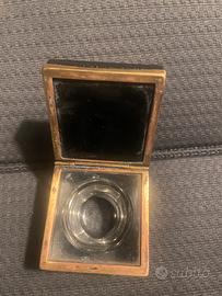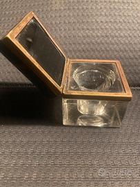 Un blocco in vetro trasperente unico soffiato all’interno porta inchiostro - bordo in metallo ottonato e chiusura con coperchio in vetro nero ha segni d’usura il coperchio leggermente sbeccato ma si puo usare normalmente . E’ un cubo 7x7