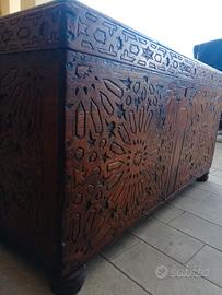 totalmente in legno di cedro Marocchino finemente intagliato a mano , lavoro di alta ebanisteria, comprensivo di maniglie in metallo, un mobile dall’estetica elegante e dal sapore retrò che però si presta ad impreziosire anche lo spazio più moderno della vostra casa. Può essere utilizzata anche come baule, panca, contenitore, cassa. Tuttte le misure si riferiscono all'ingombro massimo dell'articolo.