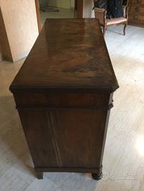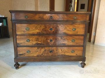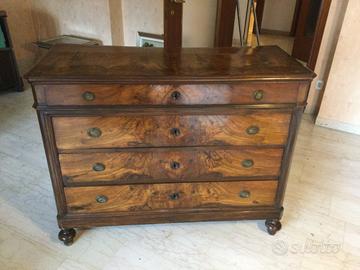 Antico cassettone in legno pregiato con intarsi e quattro cassetti, epoca metà ottocento, in perfetto stato.