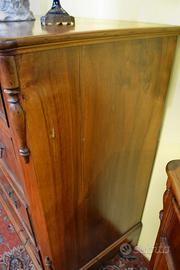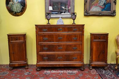 Antico cassettone con coppia di comodini cappuccino del 900 in massello di noce e lastronati in noce con una ricca venatura che conferisce al trittico un aspetto caldo e pregiato.