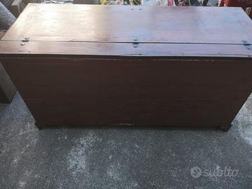 Antico cassettone con ribalta in rovere e intarsi, necessita di lieve restauro. Dimensioni cm 160 x 62 x H 80.