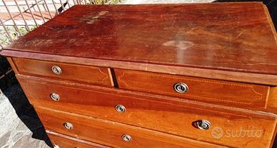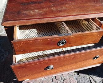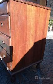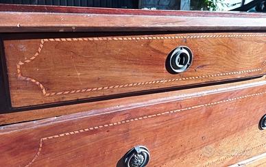 Il mobile si presenta a cinque cassetti con chiusura in battuta, in noce con filettature sul fronte cassetti e sui fianchi.
