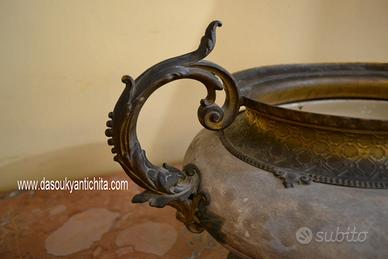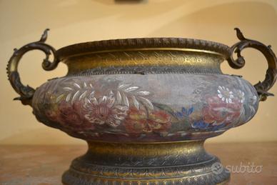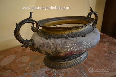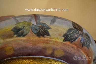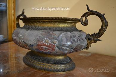Antico vaso centrotavola da collezione della Royal Bonn degli inizi del 900 in pregiata porcellana dipinta a mano a motivi floreali e fogliacei , montata su un supporto in metallo dorato , rifinito da manici raffiguranti dei pesci tritoni.