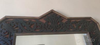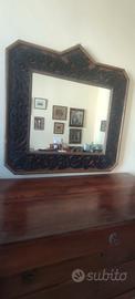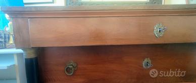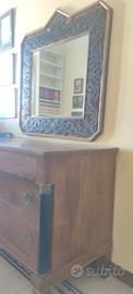 Antico comò cassettone impero, epoca XIX secolo, 3 cassetti, mis 136 x 69 h 97 ca, piccoli difetti dovuti all'età Specchiera in legno scuro, bordo interno ed esterno dorato, mis 112 x 114 ca