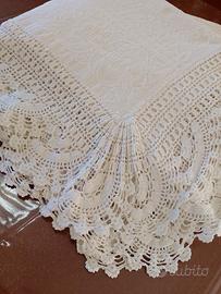 Originale, questo copriletto è impreziosito su tutto il perimetro cioè su tutti 4 i lati dal merletto fatto ad uncinetto ed alto ben 18 centimetri, il copriletto è di grandi dimensioni compreso bordo cm 305x287 circa.