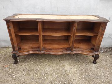 Presenti tre ante con ripiani interni, maniglie, serrature e cerniere originali. Radica e struttura massiccia in ottime condizioni. Gambe curve intarsiate e intagliate e modanatura in noce. Marmo rimovibile ma molto fragile e con delle crepe. Anche la parte superiore in legno è rimovibile. Lunghezza 198 cm x profondità 63 cm x altezza totale 148 cm x altezza solo mobile 98 cm
