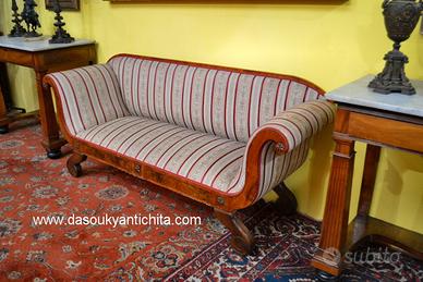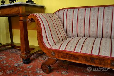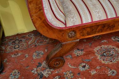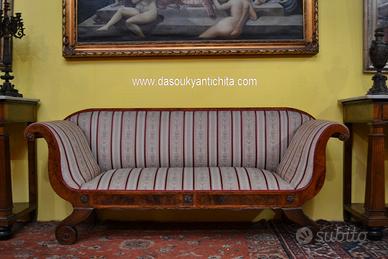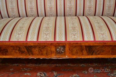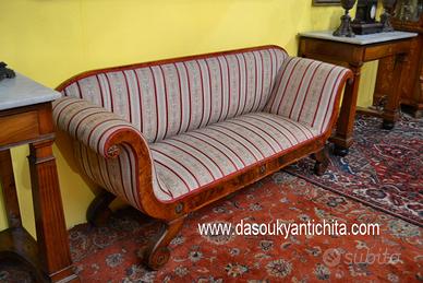 Antico divano stile Biedermeier fine 800 inizi 900 in noce e radica di betulla, schienale lineare si estende senza interruzione fino ai braccioli