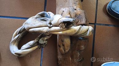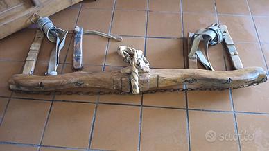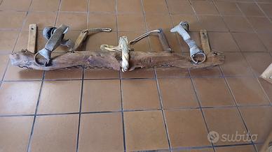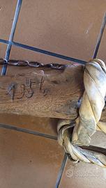 Antico giogo in legno, un attrezzo agricolo tradizionale utilizzato per accoppiare due buoi e permettere loro di trainare carichi o aratri. Materiale: Realizzato in legno rovere invecchiato. Funzione: Dispone di incurvature per adattarsi al collo degli animali e sistemi di fissaggio (sottogola) in cuoio. Oggi è spesso conservato come oggetto d'arredo rustico o cimelio storico. È provvisto di antica catena, utile per appenderlo sulla parete.