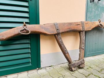Vendo ANTICO GIOGO ORIGINALE per buoi, realizzato in legno massello con ferramenta e anelli laterali originali. Un pezzo autentico di vita contadina, perfetto come elemento di arredo rustico. Il legno presenta le naturali tracce del tempo che ne certificano l'originalità e il fascino tipico di un attrezzo agricolo tradizionale.